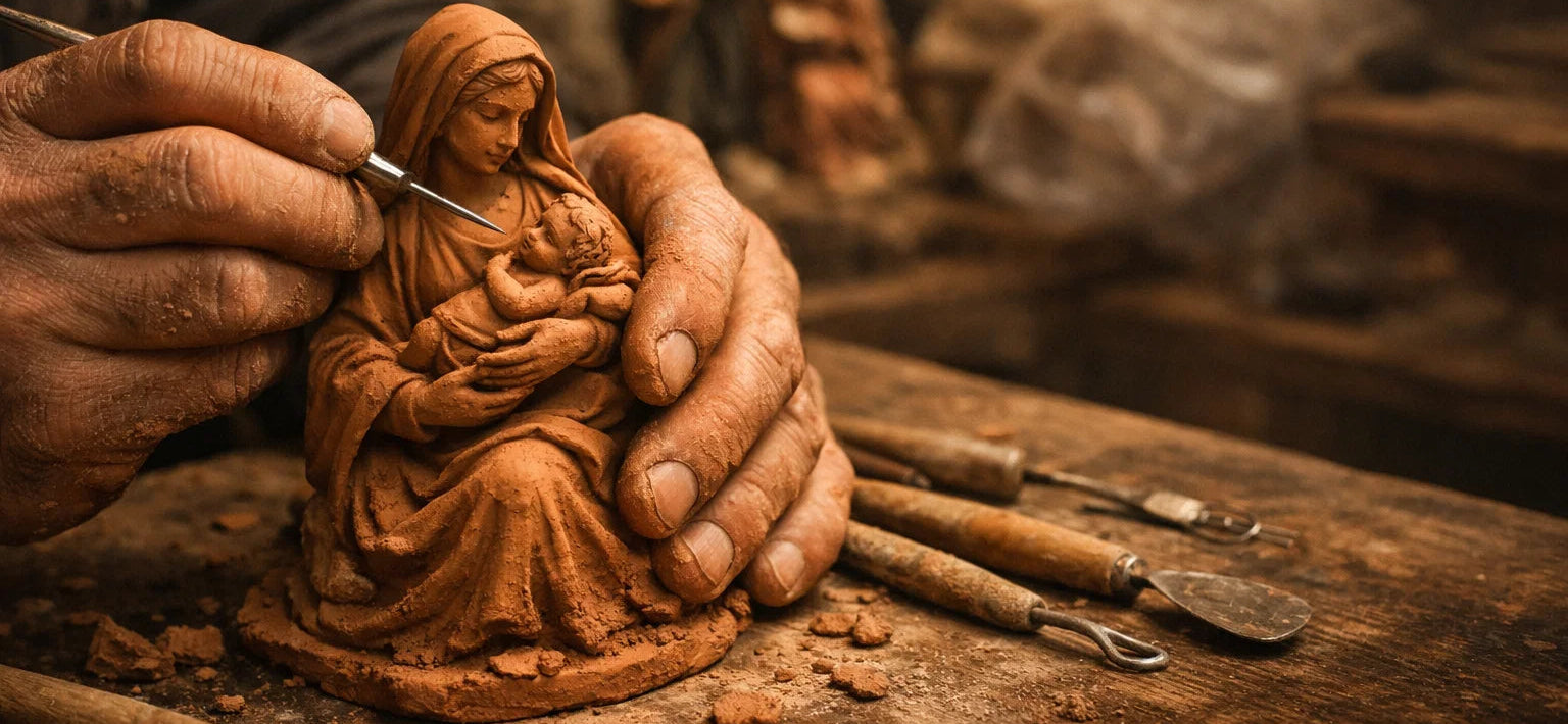 The Buonincontro workshop is the result of a genuine passion for Neapolitan nativity scene art , passed down and reinterpreted through expert hands and an ever-living creative spirit. Each creation is born from the skill of master Michele, a self-taught craftsman , who with dedication and precision transforms raw materials into characters rich in expression and history.